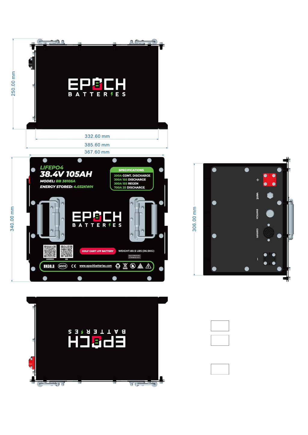 The Epoch LiMax Series Kit is a 36V 105Ah lithium iron phosphate (LiFePO4) battery designed as a drop-in replacement for standard lead-acid golf cart batteries. Compatible with EZGO TXT, EZGO RXV, Club Car Precedent, Club Car DS, Yamaha Drive, and Yamaha G29 36-volt golf carts. This battery weighs 81 lbs and replaces six 6V lead-acid batteries (typically 400+ lbs total). The battery provides 4,032Wh of energy storage, offers 3,500 charge cycles, and includes a built-in 200A Battery Management System with Bluetooth monitoring and IP67 waterproof protection.